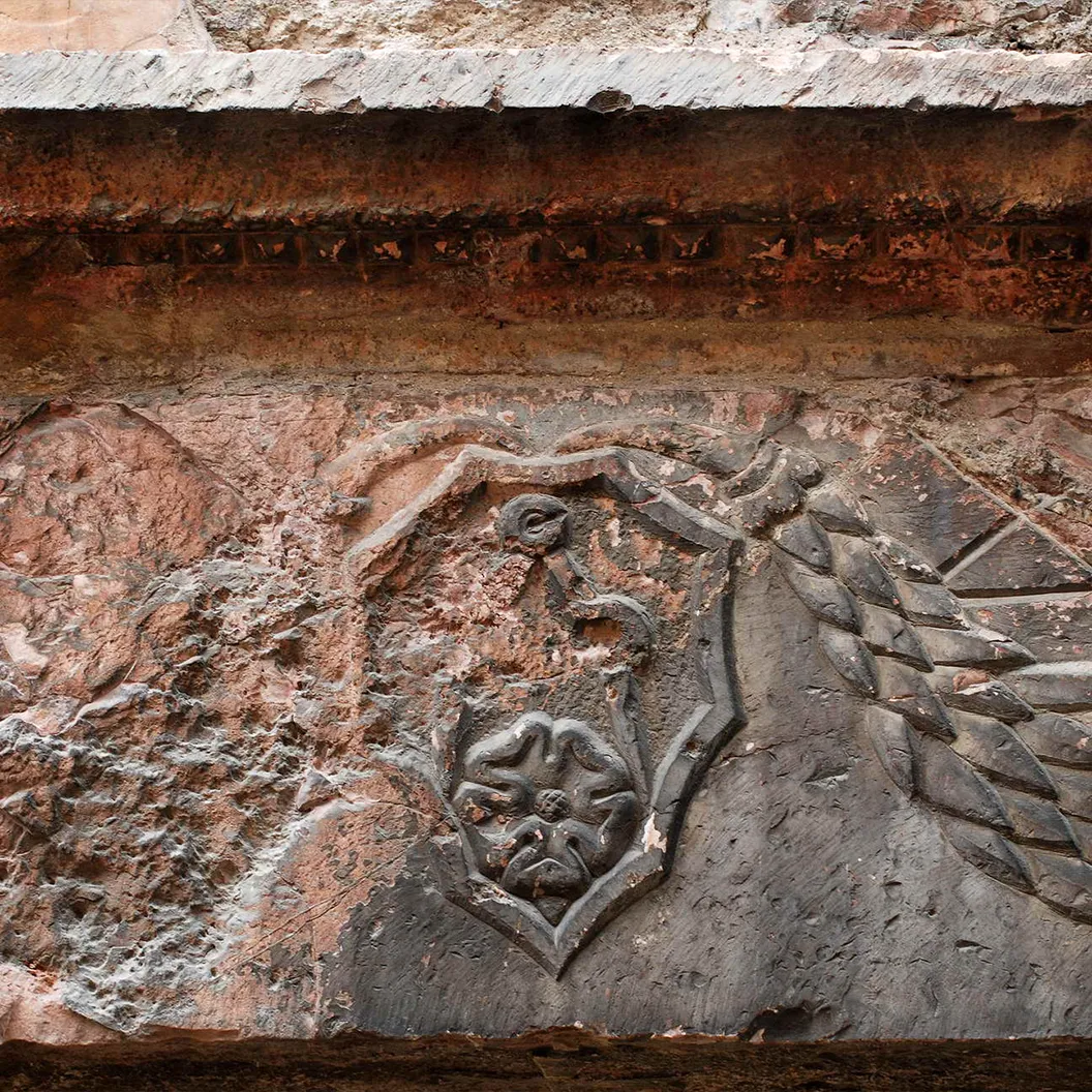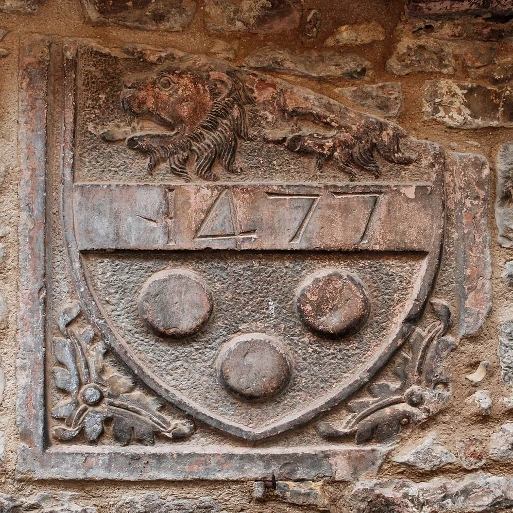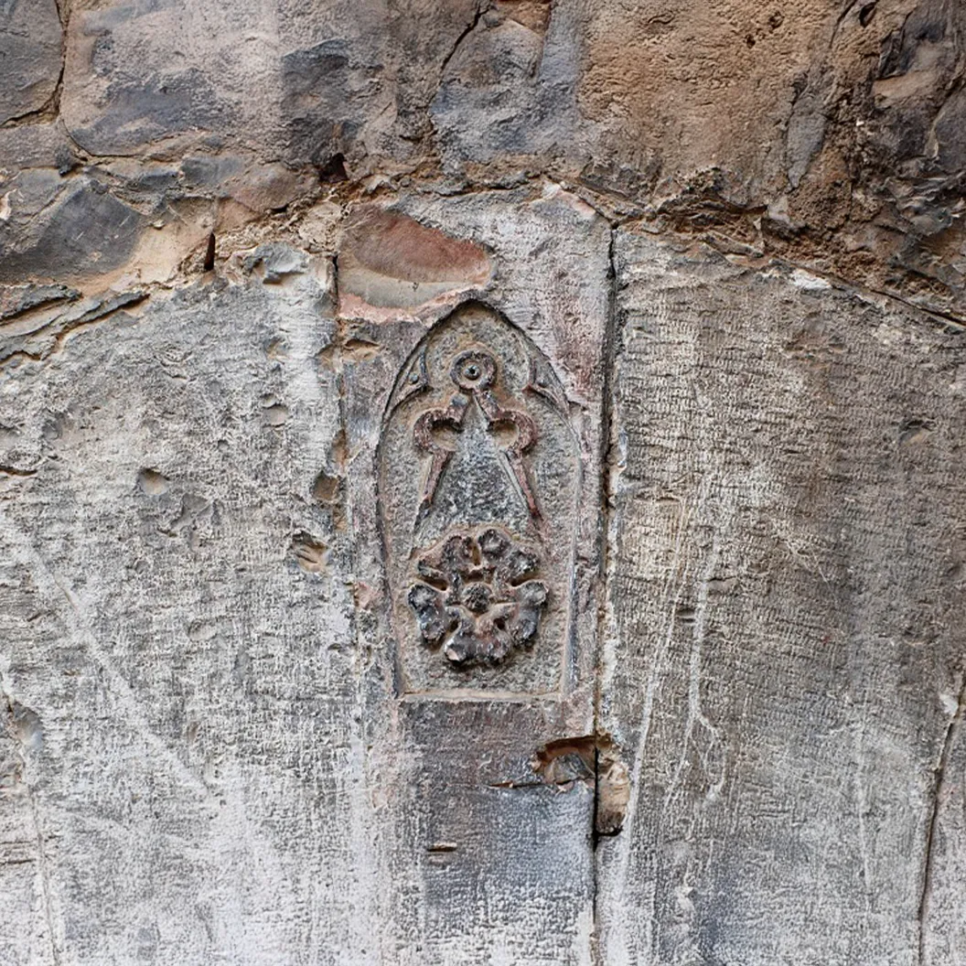 Fra due festoni è scolpito uno stemma con un compasso aperto ed un fiore, insegna dei Mastri Comacini, cioè di quelle maestranze (muratori, scalpellini, lapicidi) che qui presero dimora durante i lavori di riparazione o costruzione di chiese, palazzi, abitazioni e ponti, provenendo in gran numero dalle "parti della Lombardia", in modo particolare da Como, e perciò detti "Comacini".