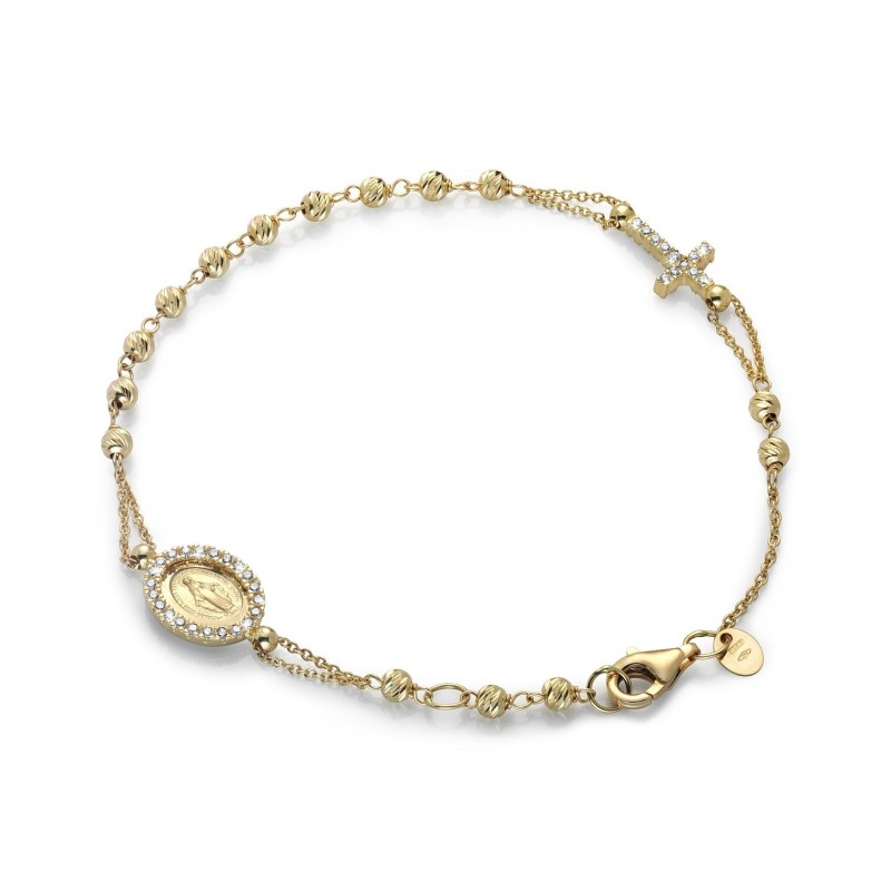 Bracciale rosario in oro giallo 18 Kt con grani diamantati, Madonna Miracolosa impreziosita da un pavè perimetrale di zirconi e croce con pavè di zirconi su entrambe i lati